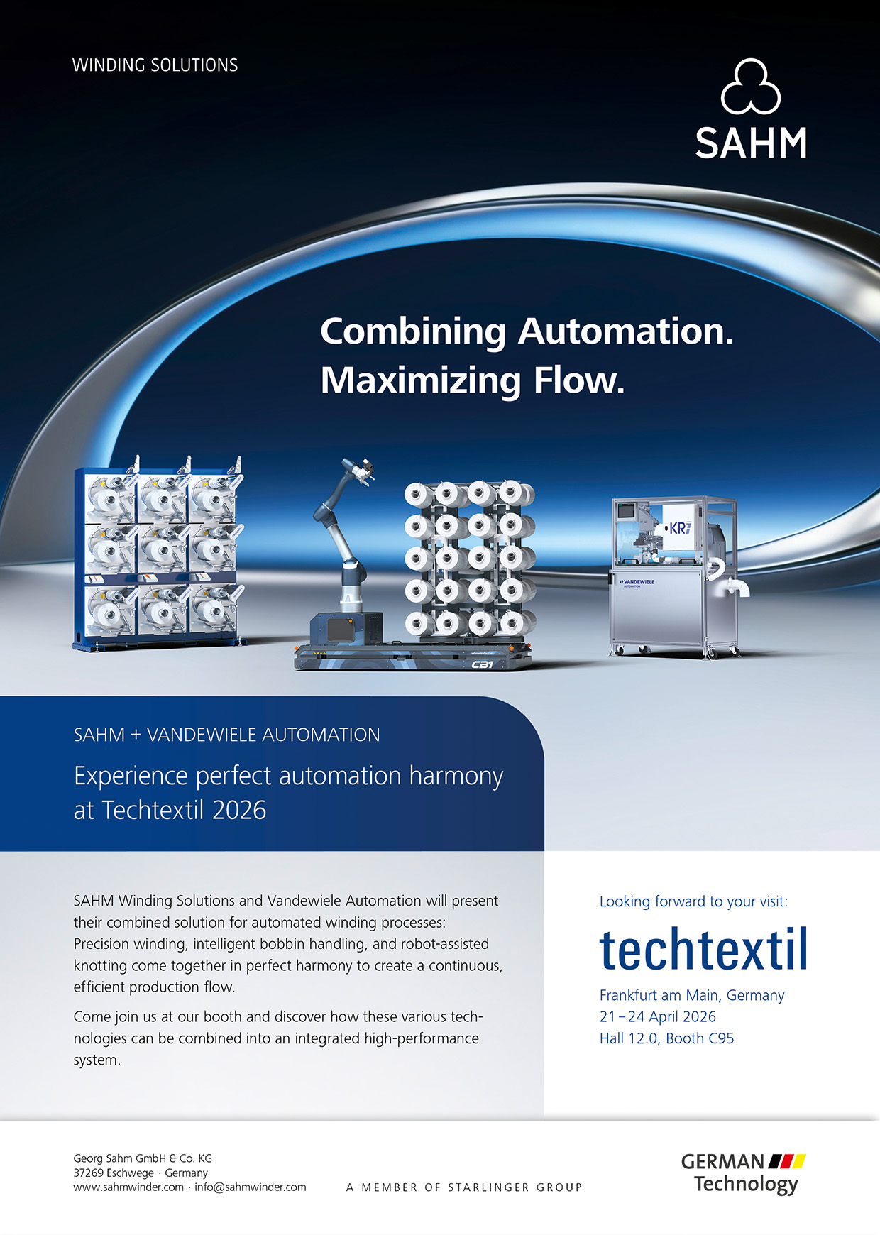 For the first time at the Techtextil trade fair in Frankfurt am Main, Germany (21 - 26 April), SAHM Winding Solutions and Vandewiele Automation will be showcasing their combined automation expertise for industrial winding processes. Under the motto “Combining Automation. Maximizing Flow”, the two companies will demonstrate how automated package handling and robot-assisted yarn knotting can be integrated into a continuous production flow.